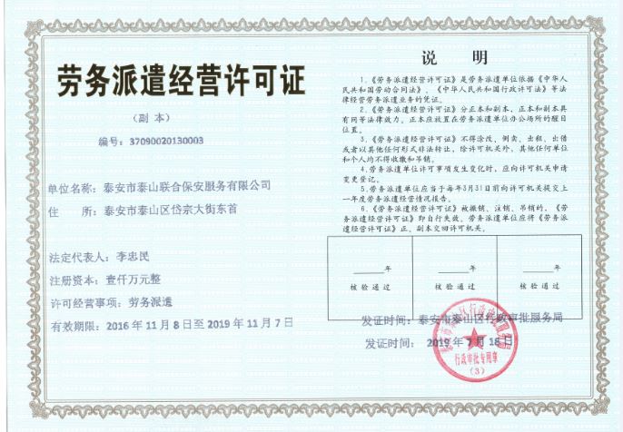 泰安市泰山聯(lián)合保安服務(wù)有限公司簡(jiǎn)介 我們的宗旨是:安全留給客戶(hù),風(fēng)險(xiǎn)我們承擔(dān)。 我們的精神是:堅(jiān)毅、求實(shí)、拓展。 我們的方針是:知法、遵法、守法、依法。 我們的目標(biāo)是:為泰城大環(huán)境的改善,為人民安居樂(lè)業(yè),為市場(chǎng)經(jīng)濟(jì)發(fā)展,為建設(shè)平安和諧泰安作出貢獻(xiàn),為客戶(hù)提供優(yōu)質(zhì)安保服務(wù)。 泰安市泰山聯(lián)合保安服務(wù)有限公司是經(jīng)工商行政管理局登記注冊(cè),山東省公安廳批準(zhǔn)成立,系中國(guó)保安協(xié)會(huì)理事單位,是具有《保安服務(wù)許可證》(魯公保服20130021號(hào))的合法經(jīng)營(yíng)單... >>詳細(xì)