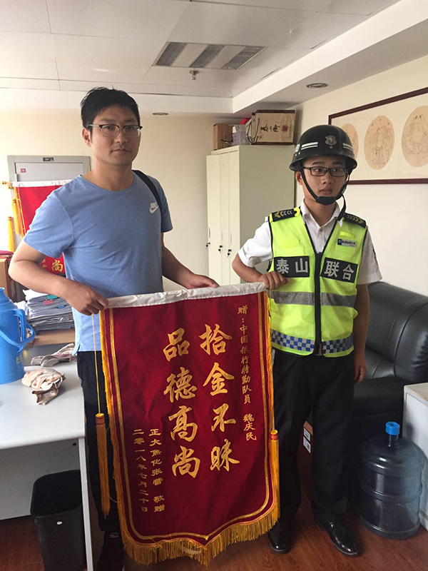2018年7月20日,公司駐中行保安隊員魏慶民同志在儲蓄網(wǎng)點(diǎn)大廳執(zhí)勤巡邏時,撿到客戶丟失的錢包并及時交至該網(wǎng)點(diǎn)值班主任手中。后經(jīng)多方查找才找到丟失物品的主人,失主因忙于辦理業(yè)務(wù)而將錢包證件不慎丟失,經(jīng)查內(nèi)有7000余元現(xiàn)金、多張銀行卡等物品一宗,銀行工作人員確認(rèn)后將錢包完璧歸趙。該客戶送來“拾金不昧,品德高尚”錦旗表示感謝。魏慶民同志拾金不昧的精神體現(xiàn)出了泰山聯(lián)合保安全心全意為客戶單位做好服務(wù)的優(yōu)良作風(fēng)。