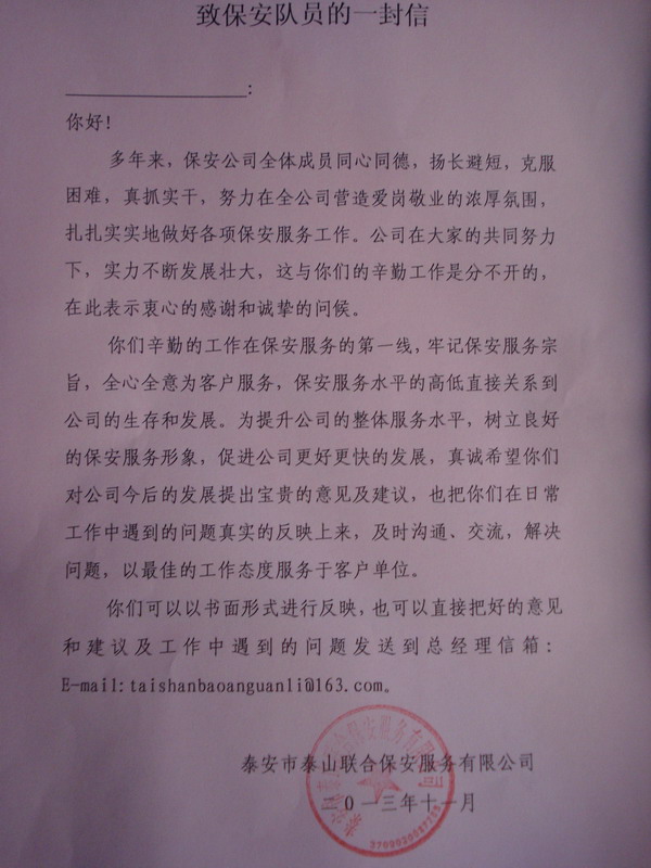近期,為提升公司的整體服務(wù)水平,公司開展了征求隊員意見及建議的活動,希望隊員對公司今后的發(fā)展提出寶貴的意見和建議。公司抽派專人走訪各駐勤點保安隊員發(fā)放信函,以此形式反饋隊員思想動態(tài),并鼓勵各駐勤單位保安員積極工作,增強服務(wù)意識、安全意識,進(jìn)一步提升公司服務(wù)水平。