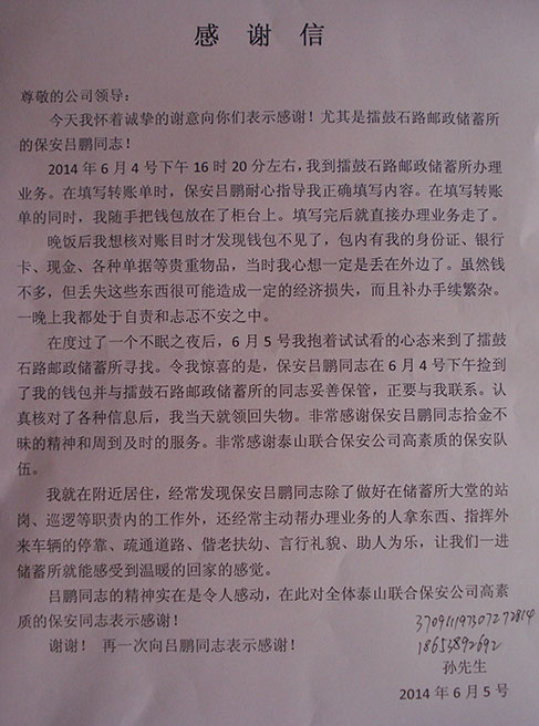 6月5日,公司收到一封來自泰城孫先生的感謝信,信中稱原來6月4日下午16時20分許,駐勤保安隊員呂鵬同志在儲蓄網(wǎng)點執(zhí)勤時,撿拾到儲戶錢包,妥善保管后歸還失主。孫先生收到丟失的錢包,看到包內(nèi)錢物一樣不少,激動萬分。該客戶感激地稱贊“銀行保安拾金不昧,保安員就是活雷鋒”。呂鵬同志拾金不昧的精神體現(xiàn)出了泰山聯(lián)合保安全心全意為客戶單位做好服務(wù)的優(yōu)良作風(fēng)。