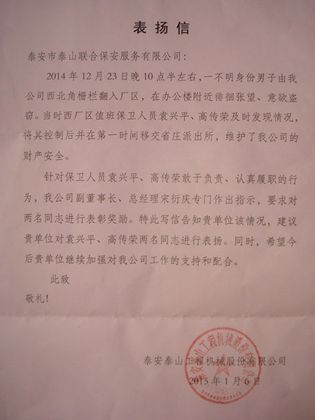 2014年12月23日晚十時許,一形跡可疑男子由泰安泰山工程機械股份有限公司西北角柵欄翻越入廠區(qū)內(nèi),在辦公樓附近徘徊,伺機實施盜竊。駐勤保安隊員袁興平、高傳榮巡邏時發(fā)現(xiàn)此可疑男子,將其控制后移送省莊派出所做進一步審理。